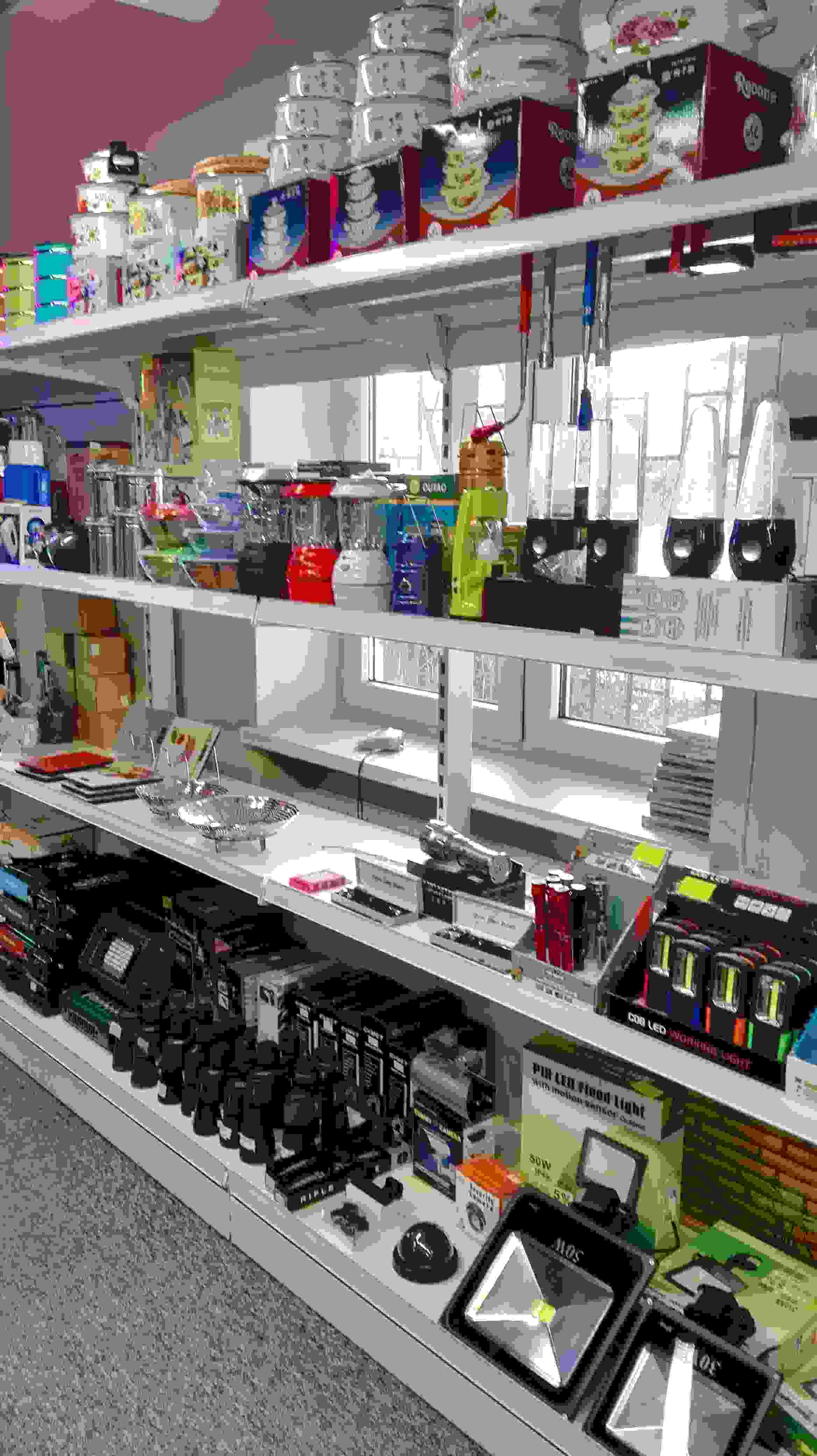 A small business that owns two stores on the same street. They sell lamps and electric kitchen appliances.